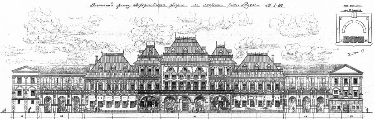 Эскиз фасада Лефортовского дворца со стороны реки Яузы. Дворец был построен для адмирала Лефорта в 1696-1699 годах по указу Петра I .