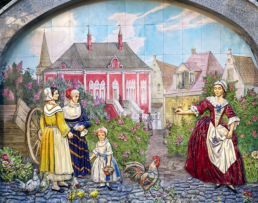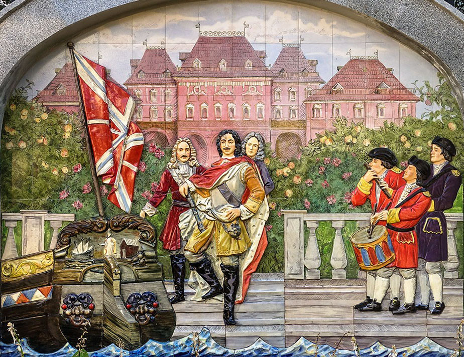 Керамическое панно у метро Бауманская о жизни в Немецкой слободе. На заднем плане - дом Анны Монс. Автор панно - Сергей Андрияка.