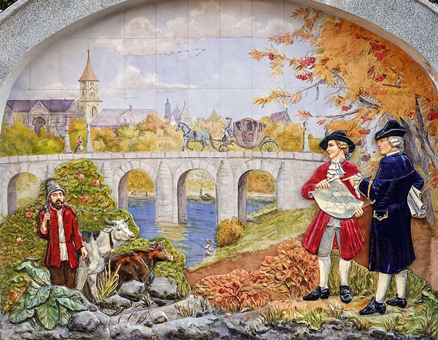 Керамическое панно у метро Бауманская о жизни в Немецкой слободе. На заднем плане - Дворцовый (ныне - Лефортовский) мост. Автор панно - Сергей Андрияка.