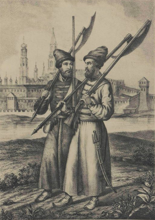 Стрельцы московских стрелецких полков Лутохина и Ивана Полтева в 1674 году. Литография середина XIX века.