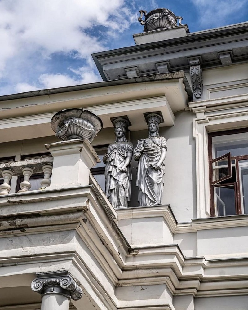 Усадьба Грачевка. Кариатиды, держащие в руках символы искусств — лиру и свиток.