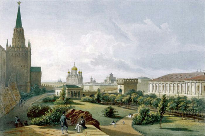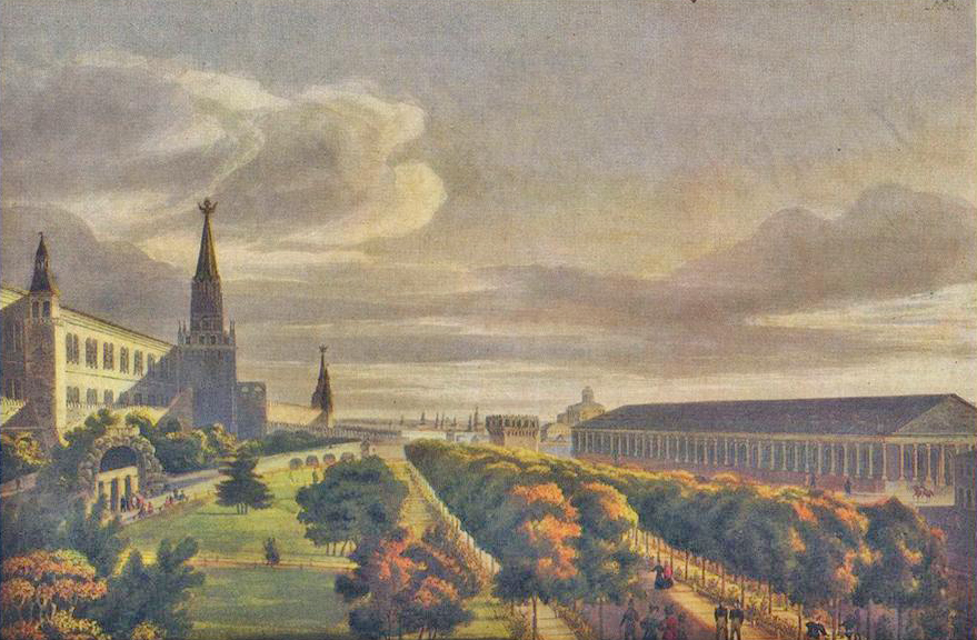 По велению Александра I «от Воскресенских ворот до Троицких около кремлевских стен и прежде бывших тут рвов и равелинов запружена была речка Неглинна». Утратившие свои функции земляные укрепления петровских времен у Кремля были срыты, осыпавшийся заброшенный ров засыпан. И в 1821-1823 годах по проекту архитектора О.И. Бове устроены на этом месте Кремлевские сады (нынешний Александровский сад), создание которых стало значимым событием в московской жизни. Очевидец торжественного открытия садов писал: «…на том месте, где за несколько пред сим месяцев видели один ров, наполненный грязью и всякою нечистотою – там возродился, как будто мановением волшебства, прелестнейший вертоград с зеленеющими деревьями и благоухающими цветами!» А Н.О. Пушкина (Ганнибал) сообщала в письме своей дочери: «Кремлевский сад великолепен, и все дамы прогуливаются на воздухе, чуть двигаясь, разодетые в пух и прах…» Со дня открытия и вплоть до середины 1830-х годов Кремлевские сады были излюбленным местом гулянья у московской публики.