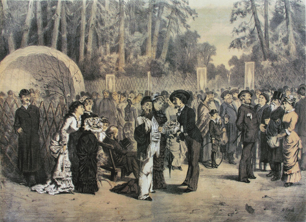 Масштаб же выставок наглядно демонстрирует акварель Л.О. Премацци «Выставка цветов в Московском Манеже» 1861 года. В громадном закрытом пространстве Манежа устроен живописный сад с чередующимися холмами и долинами, громами и фонтанами, густыми кущами, зелеными лужайками и цветниками. Представленные во множестве ботанические редкости родом из дальних регионов делают прогулку по саду похожей на экзотическое путешествие. Уставшие от долгой зимы москвичи охотно шли в Манеж, полюбоваться его роскошным убранством, поднять себе настроение и показать себя, продемонстрировать лучшие наряды.
