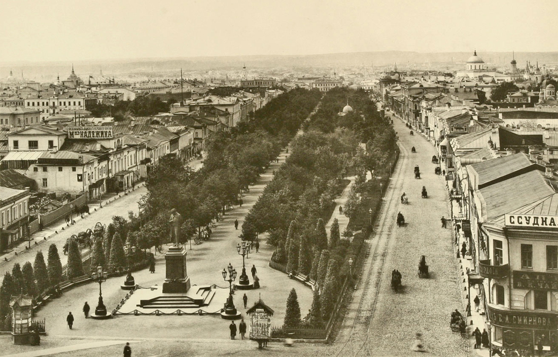 Вид на Тверской бульвар с колокольни Страстного монастыря. 1888 год. Фотогравюра Шерер, Набгольц и Ко