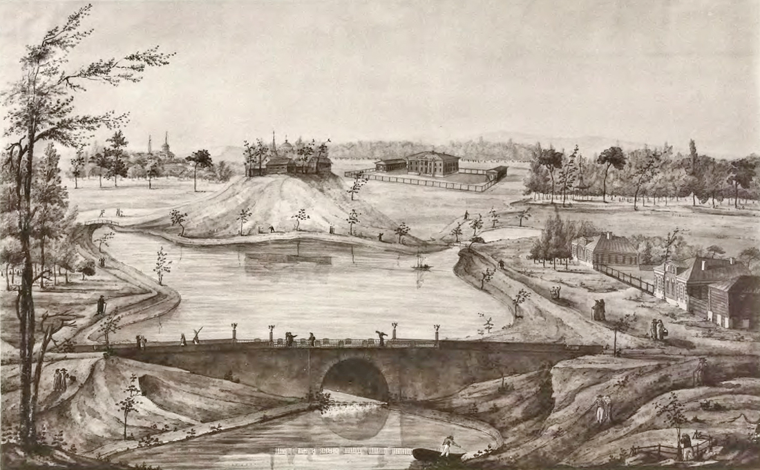 Вид Пресненских прудов и моста (с восточной стороны). Начало XIX века. Художник Осип Бове.
