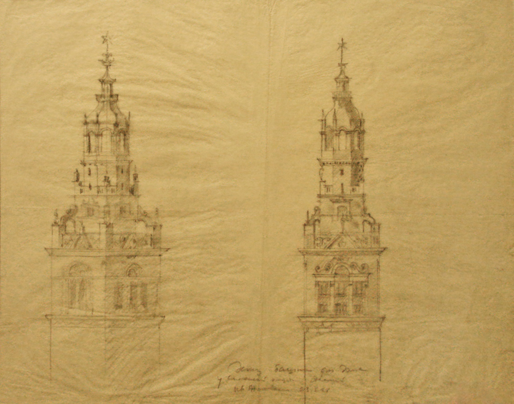 Авторские чертежи И. В. Жолтовского с разными вариантами исполнения башни.