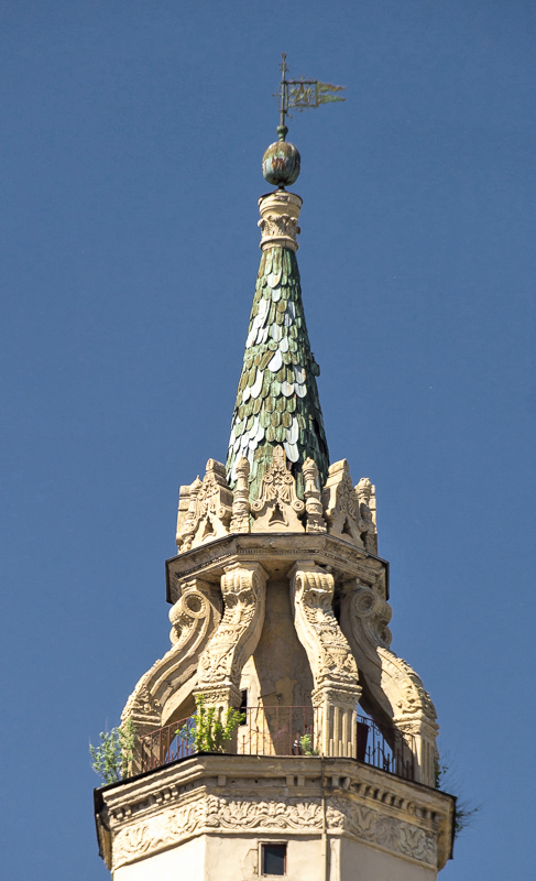 В самом деле, почему, например, изящная башня отодвинута довольно далеко вглубь от красной линии улицы? Казалось бы, ее следовало совместить с главным фасадом, закрепить угол, что чаще всего и делается в подобных случаях. Почему декоративные обрамления окон шестого и седьмого этажей не расположены с одинаковым шагом, но ритм их как-то странно нарастает в одну сторону? Такого отступления от привычных архитектурных правил вообще не встретишь… Или почему венчающий здание сложный, пластически богатый карниз неожиданно обрывается, словно на него не хватило материала, а далее продолжается просто большой свес кровли, поддержанный тонкими консолями? Почему на таком протяженном фасаде всего один балкон, да и тот смещен на угол здания?