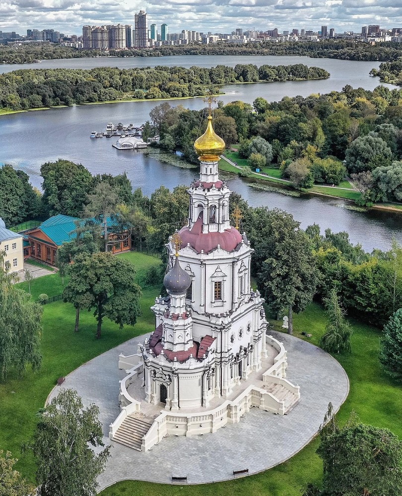 Троицкая церковь в Лыкове на фоне района Щукино.