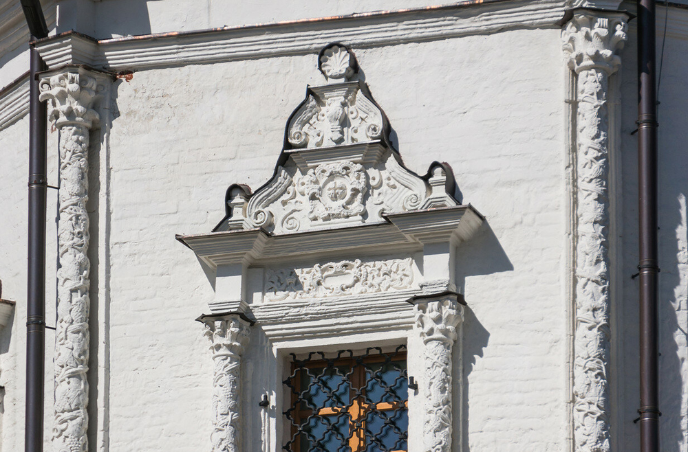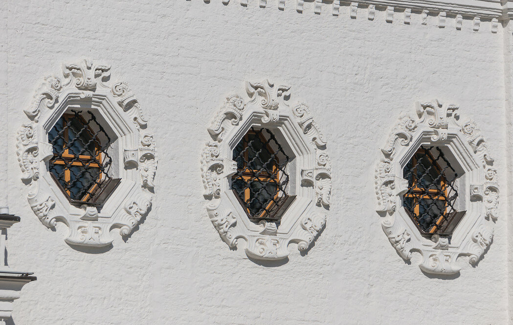 Детали экстерьера церкви. Обрамления небольших световых окон над входом.