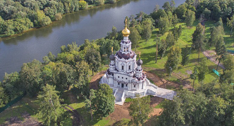 Если встать возле храма на небольшой открытой площадке над крутым, поросшим высокими деревьями склоном, перед вами откроются живописные дальние планы. Здесь, совсем рядом с современным и оживленным районом Москвы, всегда тихо и уединенно. Лишь изредка появится из-за деревьев купальщик, добравшийся вплавь из Серебряного бора, чтобы вблизи полюбоваться красотой старинного памятника.
