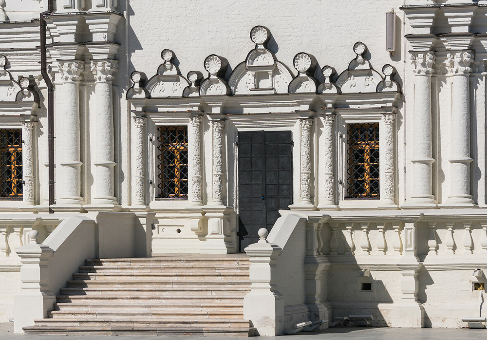 У центрального и боковых объемов размеры сходных декоративных элементов быстро убывают в каждом следующем ярусе. Это создает впечатление гораздо большей, нежели в действительности, высоты сооружения.