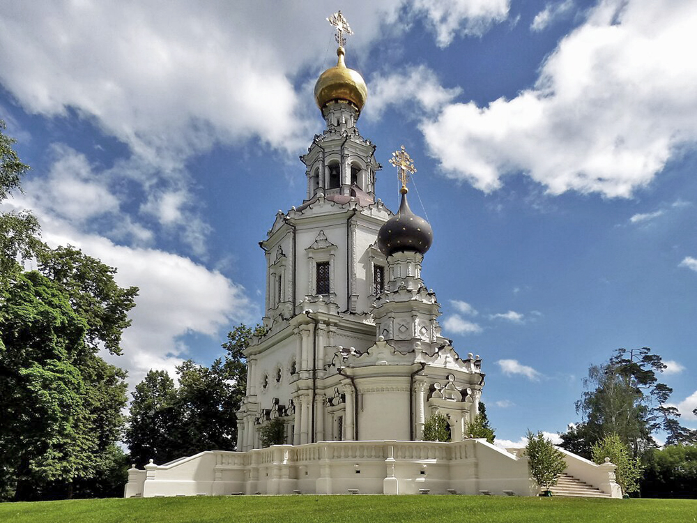 На живописных пляжах Серебряного бора в теплые солнечные дни трудно найти свободное место. «Большая вода», прекрасные зеленые острова и полуострова, увлекательные экскурсии на теплоходах, лодочные прогулки — все это делает здешние места притягательными для многих тысяч горожан. Впрочем, пейзаж Серебряного бора во многом изменился за последние десятилетия: на другой стороне красивого водоема вырос огромный район — Строгино. Многоэтажные здания на высоком берегу Москвы-реки образуют гигантский ансамбль, живописно отражающийся в водном зеркале. А несколько в стороне, обособленно от этого нового комплекса, над кронами вековых деревьев вознеслась удивительно легкая башня, увенчанная золотой маковкой. Памятник тонет в зелени — его почти не видно с ближних точек, и, может быть поэтому мало кто из посетителей пляжа приходит посмотреть на него, хотя у подножия холма останавливаются прогулочные теплоходы. Но вот что интересно: небольшая центральная главка этого храма, расположившегося на самой высокой точке крутого берега, в хорошую погоду видна с очень далекого расстояния — из Мневников, Крылатского, с дальних участков Строгина, с палубы теплохода…